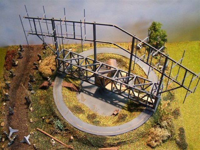 Im Modellzubehör habe ich für „teuer Geld“ die T- und Doppel-T-Träger aus Messing erworben. Der Rundlauf mit Schiene, auf dem sich das Radar dreht, ist aus Holz und Styrodur. Den Schienenkranz habe ich mit einem Zirkel eingeritzt, mit einem harten Bleistift ausgemalt und anschließend mit einem braunen Buntstift den Rost simuliert. Die Holzhütte im Radargitter wurde aus Einzelteilen im lackierten Modell zusammengebaut. Die Arbeitszeiten für Löten, Entfetten, Grundieren und Lackieren betrugen ca. 40 Stunden.