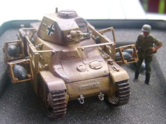 Ganz kurz etwas zum Vorbild: Diese Hotchkiss H39 wurden von der Wehrmacht im Frankreichfeldzug in relativ großer Menge erbeutet und später sogar noch weiterhin gebaut. Sie wurden meistens für Sicherungsaufgaben verwendet. Bei den Deutschen hieß dieser Panzer merkwürdigerweise Panzerkampfwagen 38 H 735(f). Vor der Invasion 1944 wurden einige Exemplare mit den Wurfrahmen 28/32cm ausgerüstet und ausschließlich in der Panzer-Abteilung 205 eingesetzt. In diesem Fall waren die Wurfrahmen aus Holz, es gab aber auch welche aus Metall.
