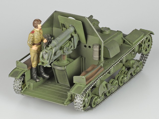 Geschichte:1930 kaufte die Sowjetunion vom britischen Waffenkonzern Vickers-Armstrong fünf leichte Panzer vom Typ Mk. E und erwarb die Lizenz zum Nachbau. Vickers-Armstrong hatte diese Panzer ohne den Auftrag der britischen Regierung entwickelt, in Serie hergestellt und mit großem Erfolg ins Ausland verkauft. In der Sowjetunion ging dieser Kampfwagen unter der Bezeichnung T-26 in die Produktion. Ab 1933 begann man in der Sowjetunion Selbstfahrlafetten auf dem Fahrgestell des Panzer T-26 zu konstruieren und als Prototypen und Kleinserien im Übungsgelände zu testen. In der Regel wurde die Turmöffnung mit einer Stahlplatte verschlossen, der Motor in die Fahrzeugmitte versetzt und die Waffe im Heck montiert. Der Nachteil dieser Konstruktion war, dass der Fahrer dann unmittelbar neben dem Motor saß und die Platzverhältnisse äußerst eng waren. Zur Erprobung 1934 kamen u.a. der Typ SU-5-1 mit Pak 55 mm oder Feldkanone 76,2 mm. Die Pak 55 mm war 1934 ebenfalls in der Erprobung, die Entwicklung endete 1940/41 als ZIS-2 Pak 57 mm. Die Pak wurde auf einem stabilen Sockel auf der Bodenplatte im Heck und der Trennwand zum Motorraum befestigt. Der Seitenrichtwert betrug 5° beidseitig, der Höhenrichtwert -5° bis + 24°. Rechts am Wannenoberteil war die Motorbelüftung angebracht, links der Auspuff. Auf beiden hinteren Kettenabdeckungen waren Sitzplätze für die Mannschaft, die Wannenbodenplatte mit Holzbohlen als Standfläche verlängert. Da für die Lagerung der Munition kein Platz war, musste die Selbstfahrlafette über Muni-Transporter versorgt werden. Soweit bekannt, ging SU-5-1 nie in Serie.