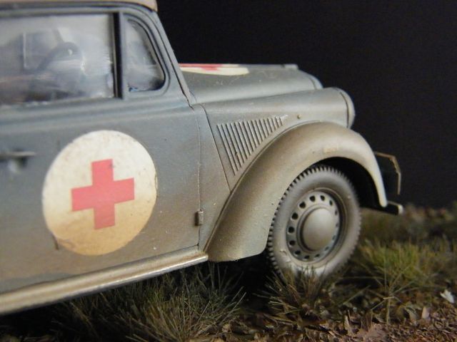 Nachdem Bronco das geschlossene Light Staff Car heraus gebracht hatte, kam ein wenig später das offene Cabrio. Der Bau selber ging sehr gut von der Hand und ohne Passprobleme. Gebaut habe ich ihn OOB, aber als Sanitätsfahrzeug. Die Passgenauigkeit war sehr gut, lackiert wurde der Wagen mit Vallejo Farben.