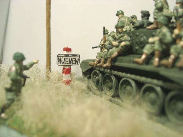 Einigen wird die Szene aus der Folge "Die Neuen" /"Replacements" der Miniserie "Band of Brothers" bekannt vorkommen. Genauer die Szene vor der Ortschaft Nuenen, in der ein Soldat seine Kameraden darauf aufmerksam macht, dass hier Vincent van Gogh geboren wurde (laut Wikipedia ist das falsch), er stößt verständlicherweise nur auf wenig Interesse. Die sitzenden Figuren und die Panzerbesatzung sind aus "American Tank Riders" von Hät, der Rest von Revell.