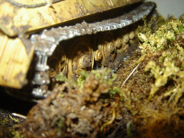 Die Ätzteile für die Grills sind von Aber, die Abschleppseile von SKP, das dünnere Kabel für das Aufziehen der Kette ist Eigenbau, gedrillt mit einer Akku-Bohrmaschine. Die Kanone ist auch von Aber. Das Diorama ist auf Styropor mit Gartenmoos und Blumenerde gestaltet.