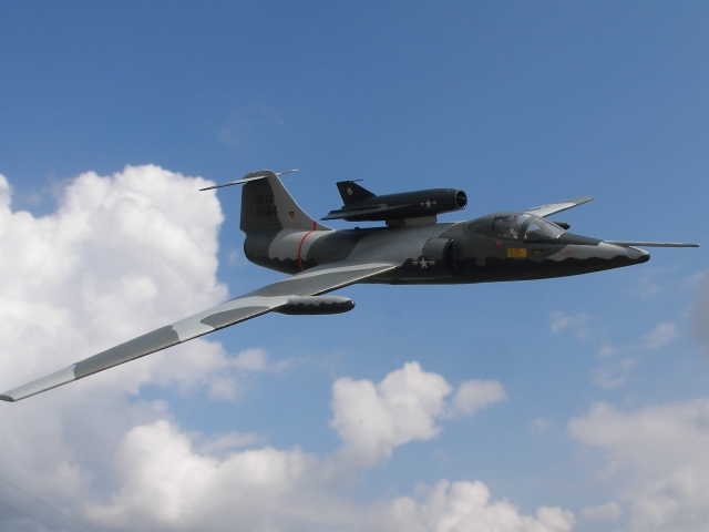 Den Rumpf der Drohne bildete ein Zusatztank einer F/A-18. Den Einlaufkegel stellte ich aus dem Vorderteil eines Starfighter-Tanks her. Der Rest entstand im Eigenbau. Tragflächen und Seitenleitwerk bestehen hier aus ABS, das ich mit Sekundenkleber verklebte. Zwei Raketenantriebe sollen die Drohne nach dem Ausklinken auf Überschallgeschwindigkeit beschleunigen, worauf das Staustrahltriebwerk anläuft. Die Raketenantriebe sind seitlich angeordnet, damit sie beim Zünden das Seitenleitwerk nicht beschädigen.