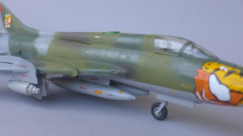 Das verwendete Modell ist im Maßstab 1:48 und aus dem Hause Eduard (Limited Edition Serie). Zwar muss man auch bei dieser Art von Bausätzen hinsichtlich Gravuren und Passgenauigkeit immer ein paar Abstriche machen, aber es liegen zusätzlich noch einige sinnvolle Fotoätz- und Brassinteile bei. Es lassen sich insgesamt drei russische, eine lybische und eine peruanische  Varianten bauen. Bei allen dargestellten Varianten ist das Farbschema sehr schön und mir ist die Auswahl schwer gefallen. Am Ende habe ich mich für die peruanische Variante der "Grupo Aereo No11. Escuadron Aereo 111" aus Talara entschieden. Das Modell wirkt etwas grob, gerade im Bereich des Fahrwerkes, der Luftbremsen, des Cockpits und beim Schwenkflügelansatz. Dagegen entschädigen das schöne Brassin Cockpit, der Schleudersitz und die Details. Lackiert und gealtert wurde mit Gunze Farben. Da ich nicht der Freund scharfer Lackierkanten bin, wurde auch nur zur Unterseite die Kannte abgeklebt.