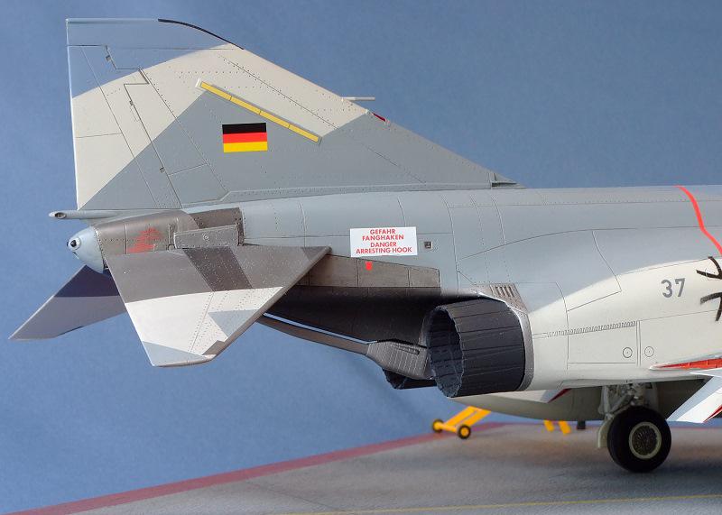 Beim Modell fiel meine Wahl wieder einmal auf den Tamiya F-4E/J Bausatz, da es in diesem Maßstab bis dato keinen besseren gibt. Dann wurden die üblichen Modifikationen, welche die äußeren Tragflächen sowie die Vorflügel, Landeklappen und die Höhenruder betreffen, durchgeführt. Auch die Reparaturbleche, welche sich ja leider über den gesamten Rumpf verteilen, wurden plan geschliffen. Die Farben bezog ich diesmal von Frickwork, da diese Marke sämtliche RAL-Farbtöne in ihrem Programm hat. Einziger Wermutstropfen hierbei, die Farben sind auf Nitrobasis. Bei einer Verdünnung von 1 zu 1 ließen sich die Farben jedoch mit einer 0,3 mm Düse sehr gut verarbeiten. Beim Versuch, die Farbe mit der 0,2 mm Düse aufzutragen, zog die Spritzpistole Fäden. Für die 37+64 benötigte ich folgende RAL-Farben: