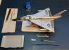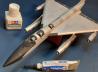 Bau/Lackierung Teil 3: Rumpf und FlügelDas Zusammenkleben der beiden Rumpfhälfen erfolgte erst nach mehrmaligen Trockenanpassung, um herauszufinden, auf welche Weise sich die schwimmenden drei Cockpitelemente nicht wieder voneinander wegbewegten. Der Radom wurde wie empfohlen mit Blei beschwert und die Spalten am Bugfahrwerkschacht mit Kleber aufgefüllt. Um die Spannungen zu meistern, wurde der Rumpf mit Maskierband stabilisiert. Es folgte die Verwendung des Eduard 72687 exterior für den kompletten Austausch der hinteren beiden Ausstiege und die Detaillierung der Kanzel, der Einbau der Nachbrenner in den Schubdüsen der vier J79-Strahltriebwerke und der zusätzlichen Streben des Bugfahrwerks. Darüberhinaus wurden mittels Cutter die Querruder und das Seitenruder als ausgestellt umgearbeitet. Bei den vier Triebwerkgondeln wurde dafür aber auf die Resinteile für die Exhaust Nozzles von Aires (7171) aus Kostengründen bewusst verzichtet.