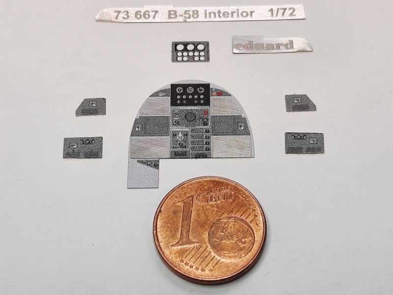 Blackdog A72035 - MK 53 / B-53 atom bomb 1:72 - Boxart Bau/Lackierung Teil 1: Innenausbau und CockpitDer Bausatz von Italeri startete erst einmal mit einer bösen Überraschung, denn die Rumpfhälten und das Cockpit der Trainerversion unterscheiden sich sehr von der Einsatzmaschine. Die zweite Sektion für den Navigator/Radar- und Bombenoffizier hat andere Armaturen und Sichtfenster, das war bei den Recherchen vorher leider nicht aufgefallen. Zum Glück waren aber ansonsten alle Teile Convair B-58 Italeri Nr. 142 zusätzlich vorhanden, insbesondere die drei Rettungskapseln und die notwendigen Konsolen. Für den Einbau des Eduard 73667 Interior bedeutet das natürlich einen Mehraufwand, insbsondere die Klarsichtteile der größeren Scheiben mussten nachgearbeitet werden. Vor der Lackierung mussten erst einmal alle Fotoätzteile vorsichtig ausgeschnitten, gebogen und trocken angepasst werden. Anschließend folgte die Bemalung, die Fixierung der Kleinstteile mit Sekundenkleber und letztlich der Einbau der drei Module mit Modellierstreifen.