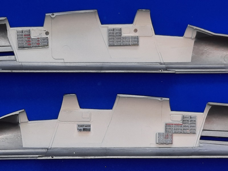 Abschleifen der seitlichen Konsolen mit dem Dremel Bau/Lackierung Teil 2: Innenausbau und CockpitItaleri gibt FS 36300 Light ghost gray und FS 35237 Dark ghost gray für das Cockpit an, im Federal Standard werden diese jedoch Aircraft Exterior Gray und Gray blue bezeichnet. Die Cockpitwände sind FS 17875 Insignia white angegeben, das ist korrekt, dafür sollen die Sitzpolster in FS 34084 Flat olive drab bemalt werden, während Federal Standard diese Farbe als Green einordnet. In den recherchierten Referenzen als Bild- und Videomaterial sind die Rettungskapseln aber rot ausgekleidet - nicht gerade hilfreich bei der Auswahl der richtigen Farben. Besonders zeitaufwändig ist das Eduard 73667 Interior dort, wo Kleinstteile mit dem Umfang einer Stecknadel - Spitze auch noch gefaltet werden müssen. Damit ausreichend Nanos mit Sekundenkleber fixiert werden können, sind diese zum Glück mehrfach vorhanden, denn ein Teil, das aus dem Griff der Pinzette entspringt, bleibt für immer verschollen. Wenn es jedoch schließlich wie bei den Schubhebeln der vier General Electric J79-Turbojet-Triebwerke gelingt, darf man zu Recht stolz sein. Mit Colorplat Brava selbstklebenden, elastischen Modellierstreifen wurden dann die drei Cockpitsegmente eingebaut. Hierbei wären mehr Klebepunkte bei den Rumpfhälfen und erhabene Führungslinien innen hilfreich gewesen. Durch den Einbau der vielen zusätzlichen Fotoätzteile war leider die Statik insbesondere durch die Instrumententafel des Piloten nachhaltig gestört. Mittels kariertem Papier wurden die Sektionen immer und immer wieder neu ausgerichtet, was schließlich dazu führte, dass das Material ermüdete und letztlich einige winzige, bereits mühevoll verklebte Details, wieder abbbrachen.