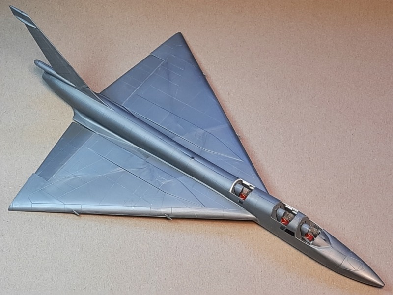 Zusammenbau der B-58 Hustler Rumpfhälften Bau/Lackierung Teil 4Absolut unzeitgemäss ist geforderte Montage der vier Triebwerke, während bei den beiden aussenliegenden Bauteilen noch deren Aufhängungen vorab verklebt werden konnten, versehentlich wurde hier durch zu hohen Anpressdruck ein Schaden verursacht, gibt es für die innenliegenden Triebwerkgondeln weder Bohrungen noch Führungen, was die spätere Montage nach der Lackierung unnötig erschwert und für einen fliessenden Übergang zur Flügelkante Spachtelarbeiten und Nachlackieren erfordert. Da bei der B-58 Hustler der Lufteinlauf weiss, der Fan jedoch silberfarben ist, sind die vier unterschiedlich metallfarbenen, Turbinen-Strahltriebwerke sowohl innen als auch umfangreich zu maskieren. Mit Master AM 72-061 Pitot Tube wurde die Staudrucksonde aus Plastik gegen ein Pitotrohr aus Metall ausgetauscht und anschließend die verformte Cockpitkanzel mit Klarsichtteilkeber Model Master Clear Parts Cement and Window Maker fixiert und die Spalten zum Rumpf aufgefüllt und ausgebessert. Bei dem MB-1C Two-Component Pod (TCP) und seinem Vorgänger MB-1 wurden flüssige, weiße Tamiya Acrylgrundierung und Squadron Products SQ20200 White Putty Einkomponenten-Spachtel verwendet und danach beide Aussenbehälter wieder plan geschliffen.