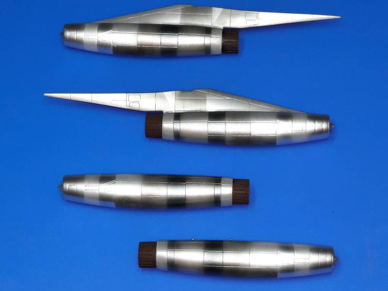 Lackierung Fahrwerk und Verdichter in silber (Revell 90) Bau/Lackierung Teil 7:Nach dem Abkleben der drei Cockpits und Fahrwerkschächte wurden alle verbliebenen Bauteile in Mattschwarz grundiert und anschließend die Bugnase und solche Flächen maskiert, die später nicht in Aluminium oder Metallfarbe gehalten sind. Als Hauptlackierung wurde dann Vallejo Artikel 77.706 White aluminium ausgewählt, an den beiden Aussenbehältern getestet und mit AK 712 Acrylic Thinner im Verhältnis 1:1 verdünnt. Das Sprühbild war eher zufriedenstellend und die Düse der Sprühpistole neigte schnell zum Austrocknen. Vallejo Artikel 77.707 Chrome und 77.716 Semi matt aluminium waren die weiteren Farben für den MB-1C Außenbehälter, der dann sowohl erneut maskiert als auch mehrfach nachlackiert werden musste, da der Acryllack der Klebekraft des Masking Tape for Curves 2 mm Tamiya 87177 nicht standhalten konnte - keine gute Voraussetzung für die Folgeschritte. Daher wurden in der Folge sämtlche Maskierbänder vorher dreimal auf der Schneideunterlage angedrückt, um die Klebekraft zu reduzieren, bevor die J79-Strahltriebwerkgondeln in jeweils fünf Metallfarben von hell nach dunkel lackiert wurden. Hierbei wurde neben den drei bereits genannten Produkten auch noch Vallejo Artikel 77.717 dull aluminium und AK interactive 798 gun metal verwendet. VERSCHLIMMBESSERN! Wer kennt das nicht, man behebt einen Fehler und produziert einen neuen, denn alle vier Farben des Vallejo Art. 77.603 Metal Color Set rissen irgendwo wieder auf. Manch einer würde vielleicht sagen, "klasse weathering", das war aber nicht mein Anspruch - letztlich wurden alle vier Triebwerke vollständig frei Hand nachlackiert, mit dem Resultat, dass die nun fließenden Übergänge das Endergebnis in meinen Augen sogar noch verbesserten.