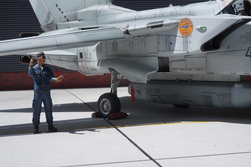 Die Aussentanks 1000 ltr und der Mittellastträger stammen vom Revell-Bausatz. Staurohr und die Anstellwinkelfühler sind Alu-Drehteile von Master-Model-PL Die beidseitigen Bordkanonenöffnungen sind bereits im Bausatz alternativ vorhanden. Eine Scharnier-Attrappe und eine Halterung an der Kabinenhaube wurde angebracht. Hilfreich und zu sehr empfehlen ist das Buch PANAVIA TORNADO IDS/ECR Luftwaffe von Andreas Klein - Christian Gerard, erschienen 2011.