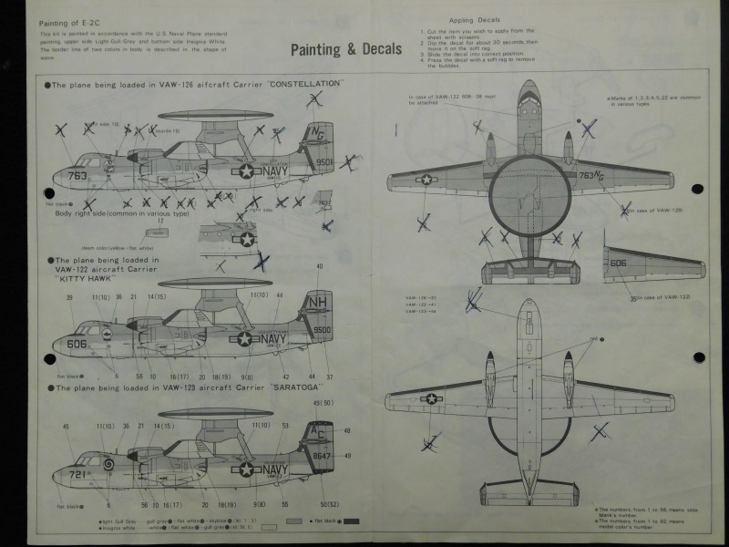 Quartett Foto-Refernezen copyright by airfighters.com und airliners.net Grumman E-2C Hawkeye Fujimi 1:72 Nr.15 von 1978 - VAW-126 Seahawks BuNo 159501Mitte der 80er Jahre bemalte ich die Modelle noch per Pinsel mit Emaillefarben und kannte auch noch nicht die Bedeutung von einer Versiegelung mit matten Klarlack. Wenn inzwischen etwas fehlt und beschädigt ist, sind es daher meistens die Nass-Schiebebilder, die durch das Tageslicht zum Vergilben neigen. Die Grumman E-2C Hawkeye von Fujimi in 1:72 Nr.15 von 1978 hat somit auch nur 61 Bauteile und ein aus heutiger Sicht grauenhaftes Cockpit, war ansonsten aber schon damals eine klasse Bausatz mit einer farbigen Lackieranleitung!