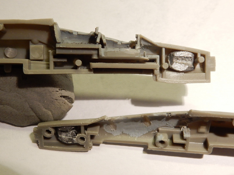 Es gab noch einige andere kleine Baustellen, den Kamerapod verfeinern, Schleudersitze, den Piloten noch Unterarme und Hände anfertigen (für Füße und Unterschenkel reichte mein Elan nicht). Sehr schwierig das Bugfahrwerk, das Teil zerbrach bei kleinsten Belastungen, musste mit Kunststoff geschient werden, was die Optik nicht verbessert - so als hätten sich beim Spritzguss verschiedene Partien des Bauteils nicht richtig verbunden?! Lackiert wurde mit selbstgemischten Revell Enamels.