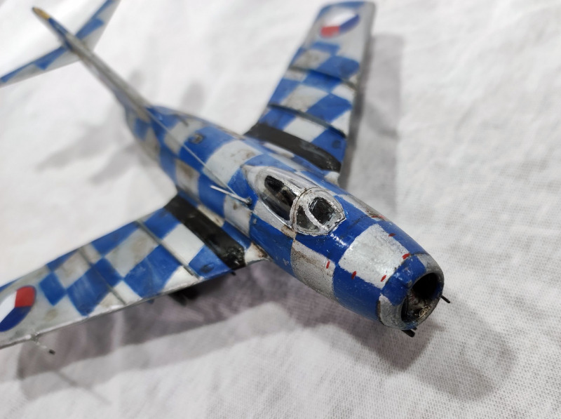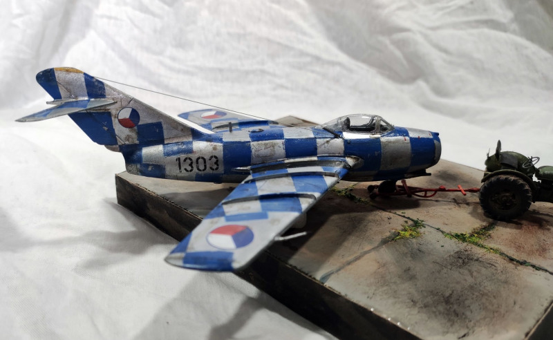 VorbildDas Vorbild war eine in Tschechien gebaute MiG-15. Diese war in den 1950er Jahren in Brno-Turnay stationiert und gehörte zur 1. Staffel des 3. Jägerregimentes der tschechoslowakischen Volksluftwaffe. Ab 1958 trug das Flugzeug diese auffällige Lackierung, um als Zielflugzeug für die Luftabwehr zu dienen. Später wurde die auffällige Lackierung wieder beseitigt und die Maschine beim 18. Jagdbomber-Regiment eingesetzt. Sie ging bei einem Absturz verloren.