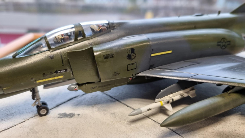 Ich stellte diese F-4E mit zwei 370 Gallonen-Tanks an den äußeren Pylonen der Tragflächen, sowie einem 500 Gallonen-Tank unter der Rumpfmitte dar. An den inneren Pylonen der Tragflächen wurden zwei AGM-45 Shrike angebracht. Die Unterrumpf-Stationen 3,6,7 erhielten die für die F-4 typischen AIM-7 Sparrows. Die Unterrumpf-Station 4 wurde mit dem ECM-Behälter ALQ-131 bestückt. Die AGM-45 und der zugehörige Launcher sowie der ALQ-131 wurden dem Hasegawa „US Aircraft Weapon Set IV“ entnommen. Die Aufhängung des ALQ-131 wurde mit Evergreen Profilen nachgebildet.