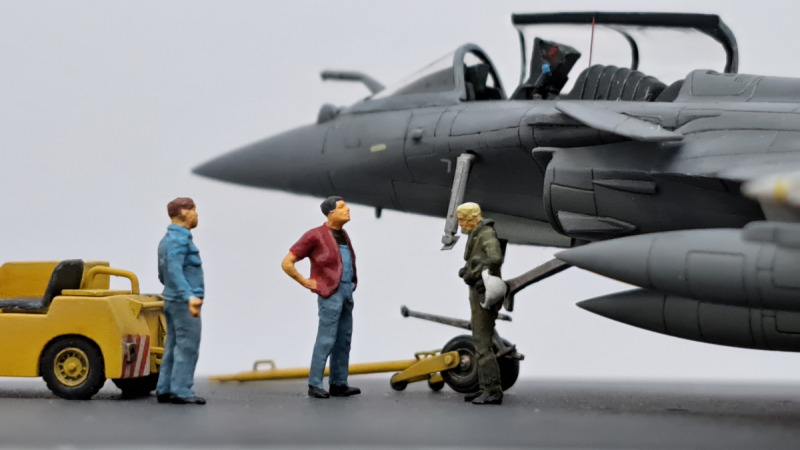 Irgendwann landete eine Rafale M von Trumpeter auf meinem Basteltisch. Der Jet, sowie die Umsetzung im Bausatz gefielen mir recht gut und der Bau wurde umgehend begonnen. Nachdem der Bau und die Lackierung im Wesentlichen abgeschlossen waren, stellte sich die Frage nach einer Präsentation. Das Modell sollte nicht einfach auf einem Holzsockel präsentiert werden, mir schwebte etwas Interessanteres, nämlich die Rafale auf einem Decksegment des Flugzeugträgers Charles de Gaulle vor.