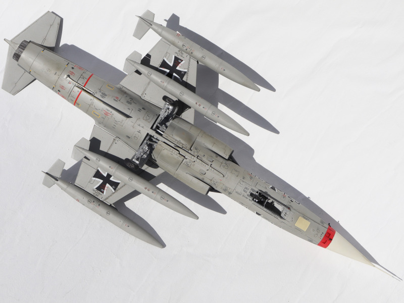 F-104G in der Strike-Rolle bei den JaboG‘sIch habe die Gelegenheit genutzt, um diesen letzten Flieger in einer Strike-Rolle darzustellen. Vier der fünf mit F-104G ausgerüsteten JaboG hatten 4 +1 (beim JaboG 36 nur 2+1) Flugzeuge in dieser Rolle in ständiger Bereitschaft vorgehalten. Erkennbar waren diese Flugzeuge äußerlich nur an der geschlossenen Abdeckung der Bordkanone, da hier anstelle von Waffe und Munition die Zusatztankanlage montiert war, die auch in die den RF-104G verbaut war. Wie diese Tanks aussahen, habe ich hier in meinem Bericht zur RF-104G dargestellt. In der Regel waren auch immer alle vier Zusatztanks an den Flügeln eingesetzt mit dem Ziel einer maximalen Reichweite. Die immer einzelne Waffenladung wäre am Centerline-Pylon aufgehängt worden. Zum Einsatz wären die B28, ab 1963 die B47 bzw. ab 1968 die B57 gekommen. Ab 1975 wurden alle „Sonderwaffen“ durch die Version B61 ergänzt bzw. ersetzt. Ich denke nicht, dass es jemals zu Flügen mit scharfen Bomben gekommen ist, und wie die Übungsträger ausgesehen haben, weiß ich nicht genau, also habe ich beim Modell auf eine Beladung verzichtet. Die Flugzeuge in der Strike-Rolle sieht man dann auch meistens nur mit den Tanks auf Bildern, ich habe nie ein Foto mit einer Beladung gefunden. Wenn man eine nukleare „Sonderwaffe“ oder den Übungsträger darstellen will, muss man zum Selbstbau greifen. Thomas Brückelt hat das in diesem Maßstab hier gezeigt.