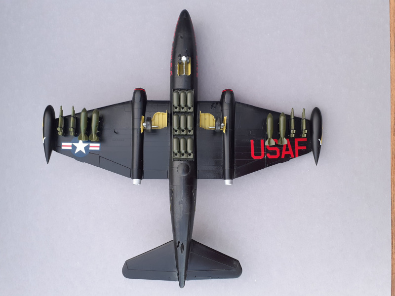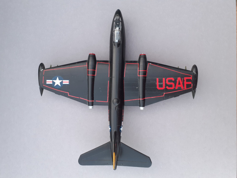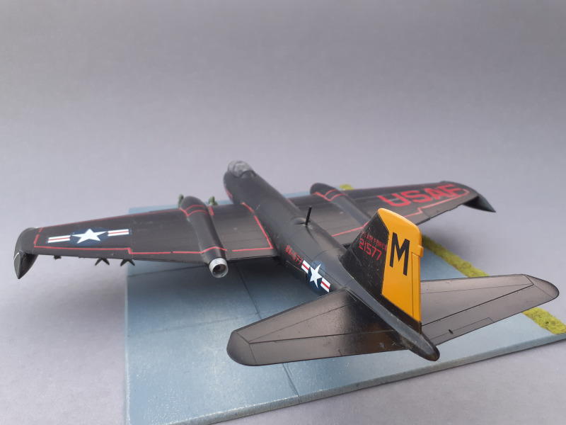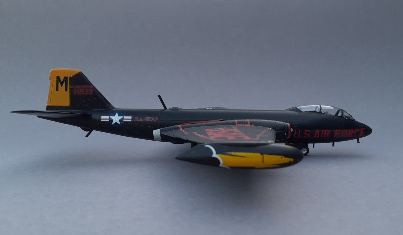 Dieses Flugzeug habe ich bereits vor einigen Jahren gebaut. Aufgrund der großen Flächen und des durchdachten Aufbaus des Modells kommt man schnell zu einem guten Ergebnis. Da ich mich für die fast komplett in schwarz gehaltene Nachtbomber-Version entschieden habe, war selbst die Lackierung kein Problem. Weil die Canberra auch als Modell ein relativ großes Flugzeug ist, braucht es entsprechend Platz in der Vitrine.