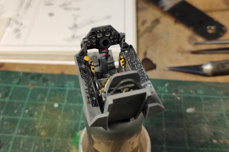 Der Revell Bausatz ist schon etwas älteren Datums. Das ist ausnahmsweise sogar gut, da der Bausatz der Sabre Dog aus der koreanischen Phase bei Revell stammt. Die Formen der Dog wurden in Korea hergestellt und sind mit das Beste, was man bekommen kann ... leider auch das Teuerste. Das merkt man dem Bausatz tatsächlich wirklich an. Die Detaillierung ist wirklich gelungen. Die Gravuren sind sehr sauber ausgeführt und gleichmäßig stark und tief. Grat sucht man vergeblich. Gebaut habe ich somit fast nur aus der Box. „fast“, weil mir die an den Sitz geprägten Gurte nicht gefallen haben, diese habe ich abgeschliffen und durch Eigenbau aus Malerkrepp ersetzt. Alles andere wurde aus der Schachtel gebaut und bemalt.