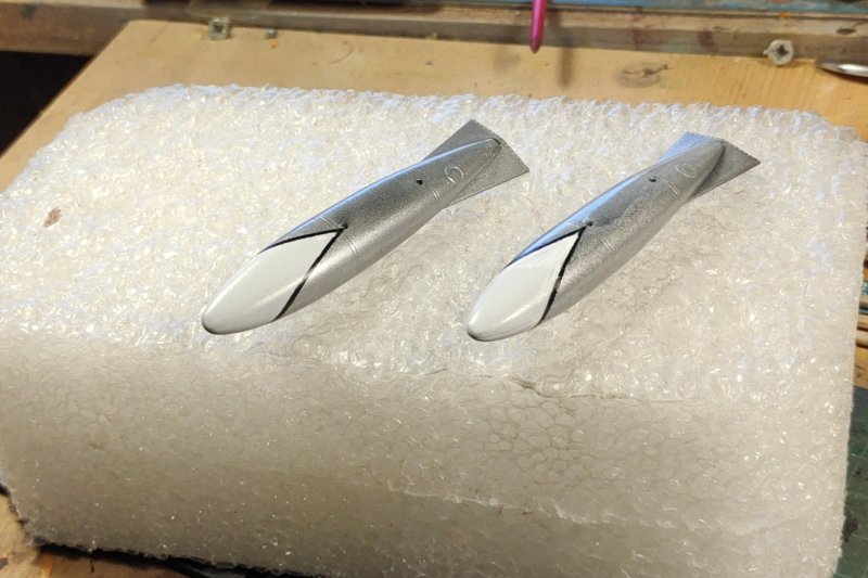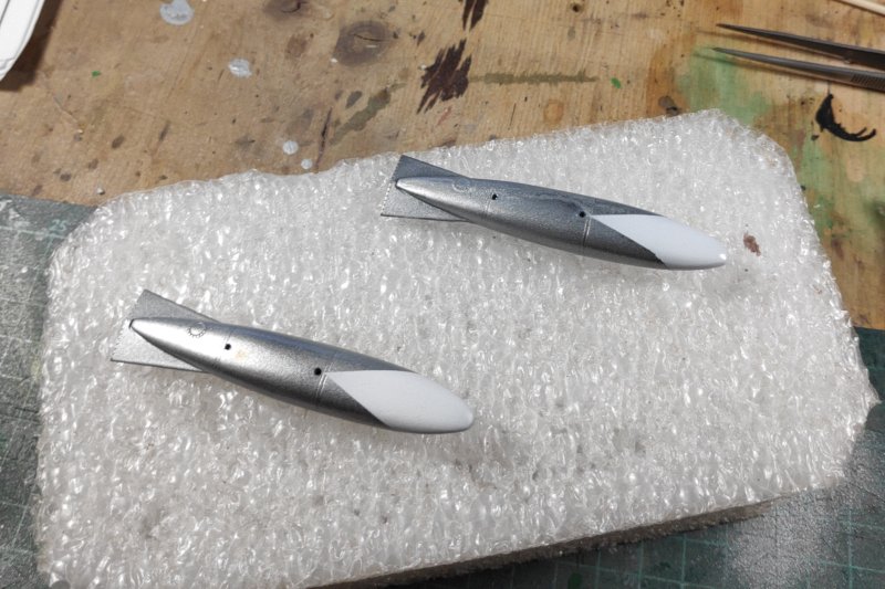 Zu den Decals kann ich sagen, dass die Mehrzahl recht gut funktioniert haben. Ich gehöre wahrscheinlich noch zu den „alten“ Modellbauern, die Decals immer noch mit „Future“ fixieren. Nur die Decals für die Außentanks dieser Variante haben für mich überhaupt nicht funktioniert. Die weißen Spitzen der Tanks mit den schwarzen Einfassungen habe ich dann alle gemalt, was einen Heidenmaskierungsspass gemacht hat.