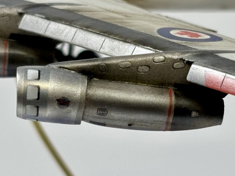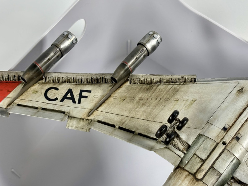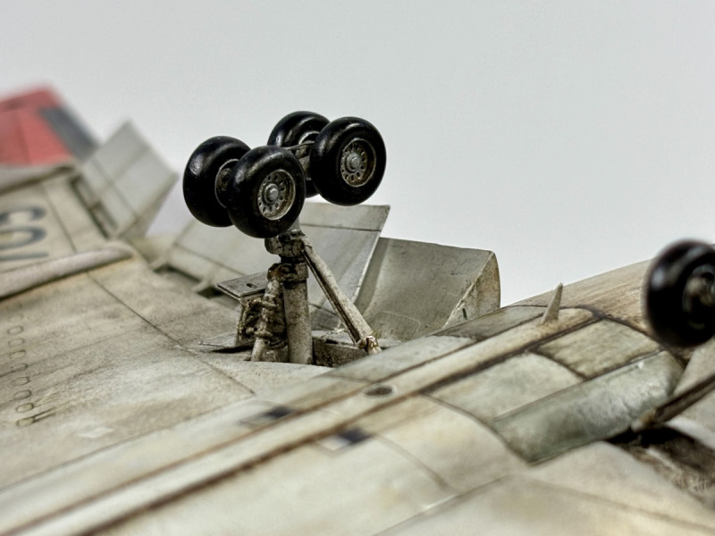Um den ausgefederten Zustand des Fahrwerks im Landeanflug korrekt darzustellen, habe ich die Fahrwerksbeine mit Evergreen-Rundstäben verlängert. Bemalt wurde das Modell wie gewohnt per Airbrush mit Acrylfarben. Für die Markierungen griff ich auf einen Mix aus 26Decals, Authentic Airliners und teilweise Nazca Decals zurück.