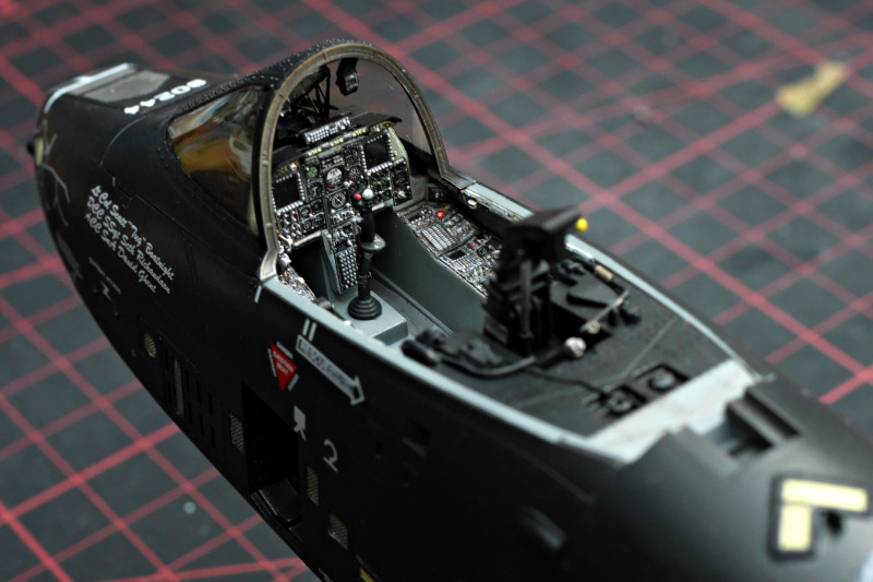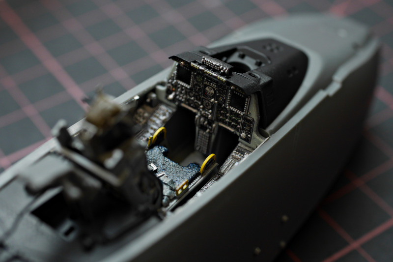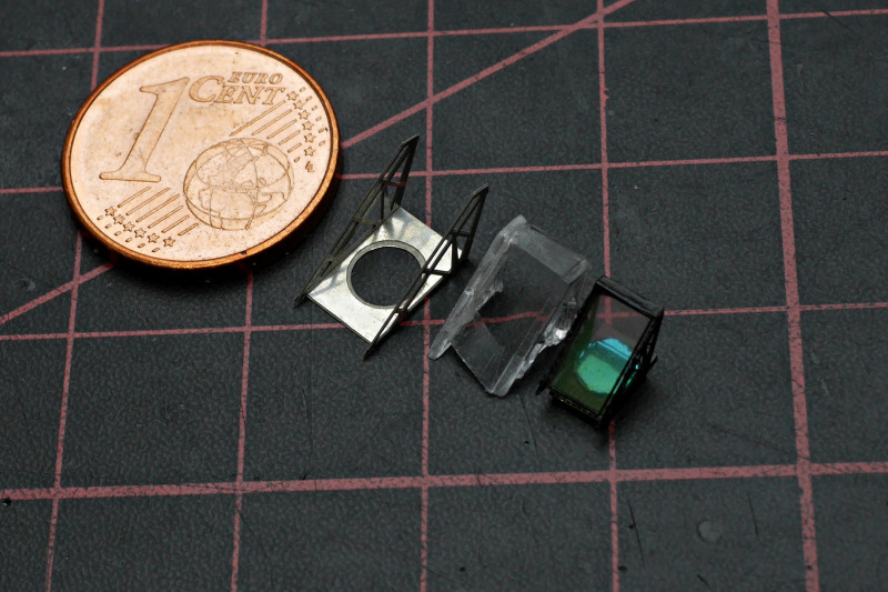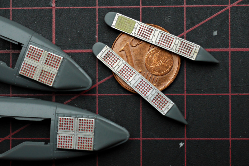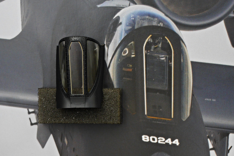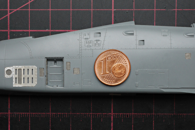 Der BauBeim Ätzteilsatz habe ich jedoch die grob geätzten Gitter durch sehr feines Edelstahlgewebe ersetzt, welches ich auf einer Ausstellung erwerben konnte. Leider hat Eduard auch das HUD versemmelt, es ist viel zu klein! Das ist völlig unverständlich, denn in den Sets für die A-10 anderer Hersteller im gleichen Maßstab (z.B. für Hobby Boss) konnten sie es doch auch korrekt?! Warum wurden die Daten nicht übernommen oder nicht wenigstens bei der Qualitätssicherung einmal gegengecheckt? Sehr ärgerlich! Ich habe mir dann mit einem solchen HUD beholfen. Da das HUD sehr prominent sichtbar ist, hat mir das Klarsichtspritzteil aus dem Kit auch nicht gefallen, da wirkt der filigrane Metallrahmen deutlich schöner.