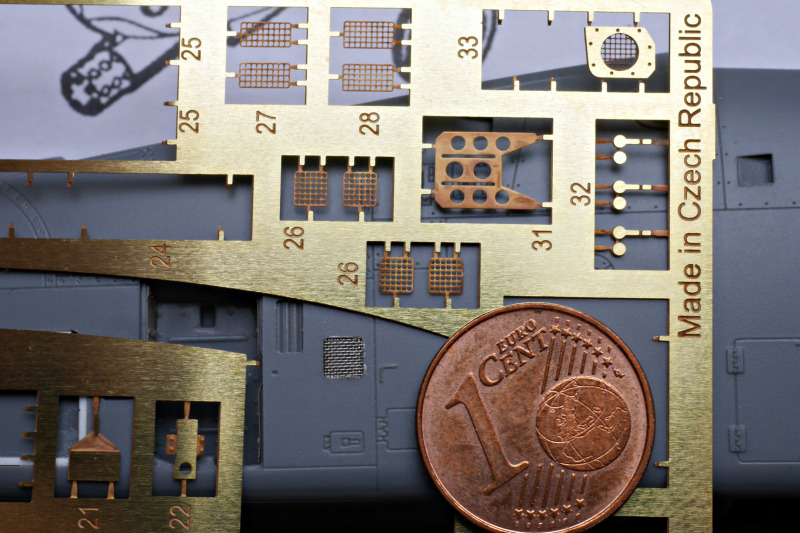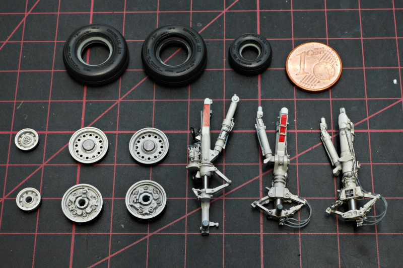 Das ZubehörAls Zubehör kamen noch Masken von Art Scale Kit dazu, 3D-Decals für das Cockpit, ein Schleudersitz aus Resin, ein Fahrwerk von Detail&Wonder mit sehr schönen Details (man beachte die unglaublichen LED-Landescheinwerfer!), der passende Ätzteilsatz von Eduard, das Pitot aus Metall. Da diese Sonderlackierung kaum beladen geflogen ist, die Pylone des Kits aber wenig Details tragen, habe ich noch ein Set von Aires dafür genutzt. Sehr praktisch fand ich auch die Wheel bay plugs von Omask, die ich hier erstmals in die Fahrwerksschächte gestopft habe.