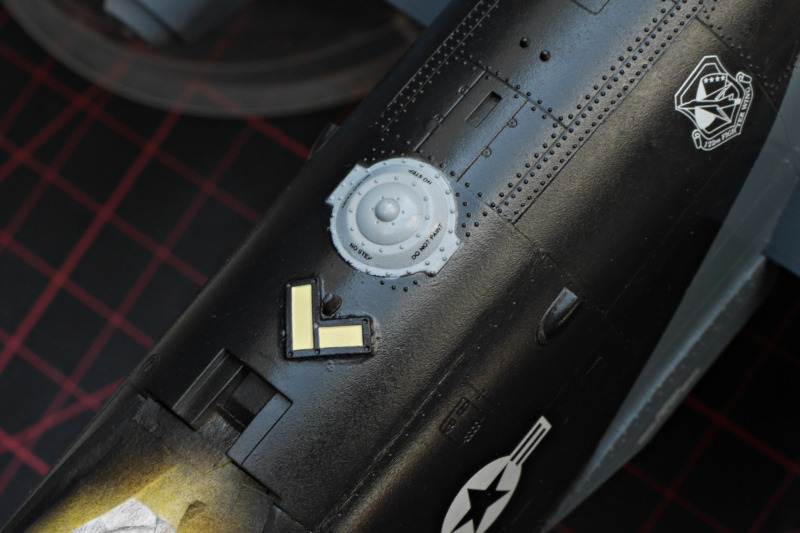 Die Aufbockbolzen wurden beim Original nicht entfernt Die Decals waren wirklich sehr gut zu verarbeiten, nur den Schlangenkopf an der Nase habe ich versaut. Ich empfehle, dieses Decal in kleinere Elemente zu teilen. In einem zweiten Versuch habe ich dann das erwähnte Zusatzdecal benutzt. Hier ist der Kopf bereits in mehrere Elemente aufgeteilt.