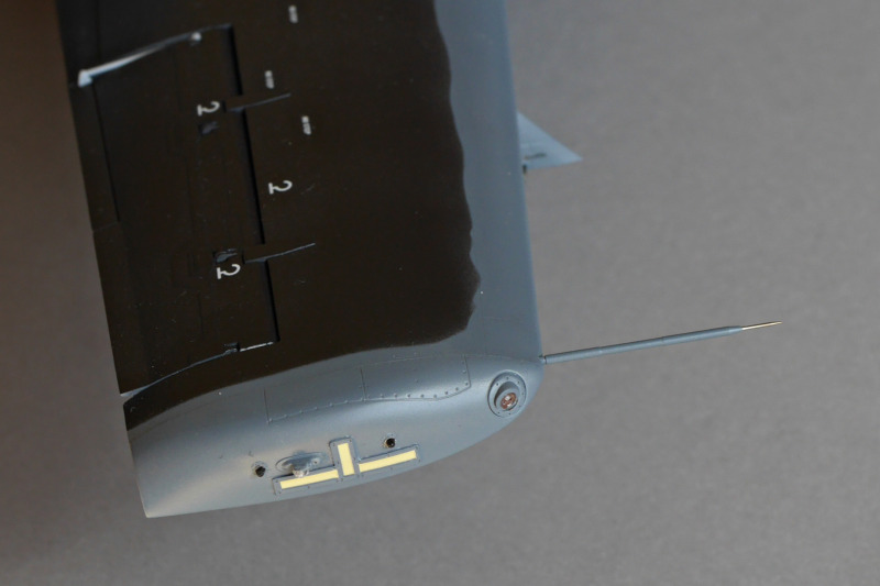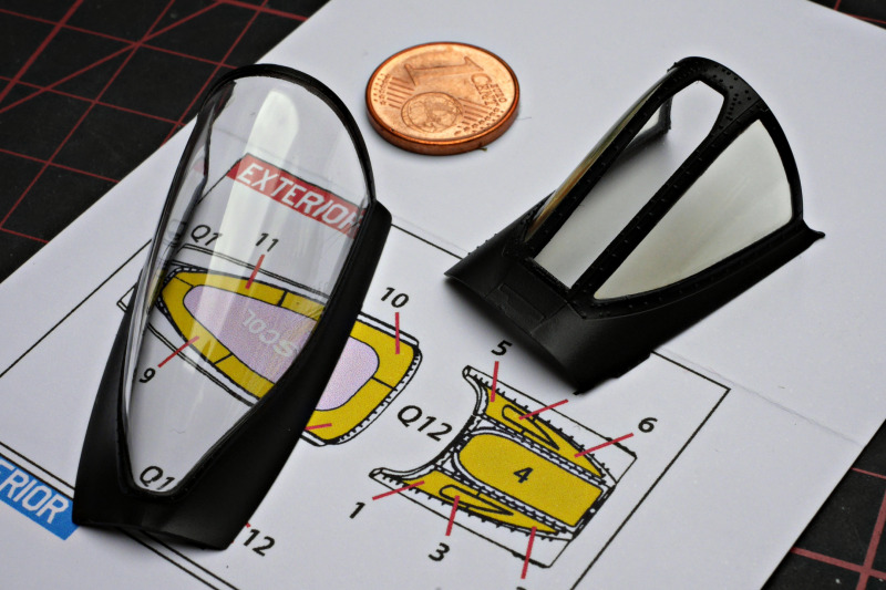 Die LackierungDie Lackierung erfolgte mit Acryl-Lacquers von Mr. Paint. Statt Schwarz habe ich NATO-Black genutzt und das Gunship-Gray hat diesen schönen Blaustich wie auf den Fotos des Originals. Einige Zeit habe ich auch mit der Behebung von Missgeschicken verbracht. Bei der Abtönung der Seitenscheiben erzeugte die Airbrush einen Spritzer. So habe ich die Farbe mit dem zugehörigen Verdünner entfernt, um neu zu lackieren - natürlich ohne vorher zu testen. Anfängerfehler, das Cockpitglas war danach stumpf! So durfte ich mit den abgestuften Schleifpasten von Tamiya, Wattestäbchen und viel Geduld den Glanz wieder herstellen. Nach einem Bad in Future habe ich es aber sehr lange aushärten lassen, bevor ich mich an die Maskierung und Neulackierung wagte, um erneute Probleme möglichst auszuschließen.