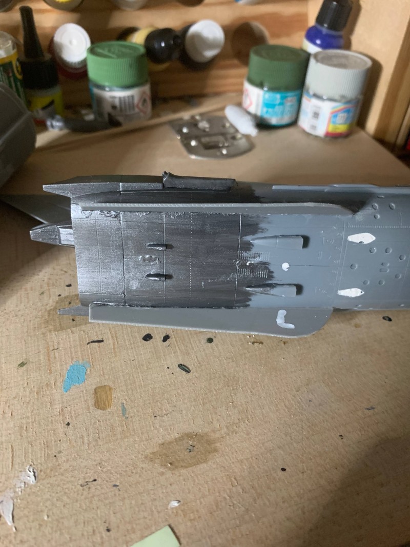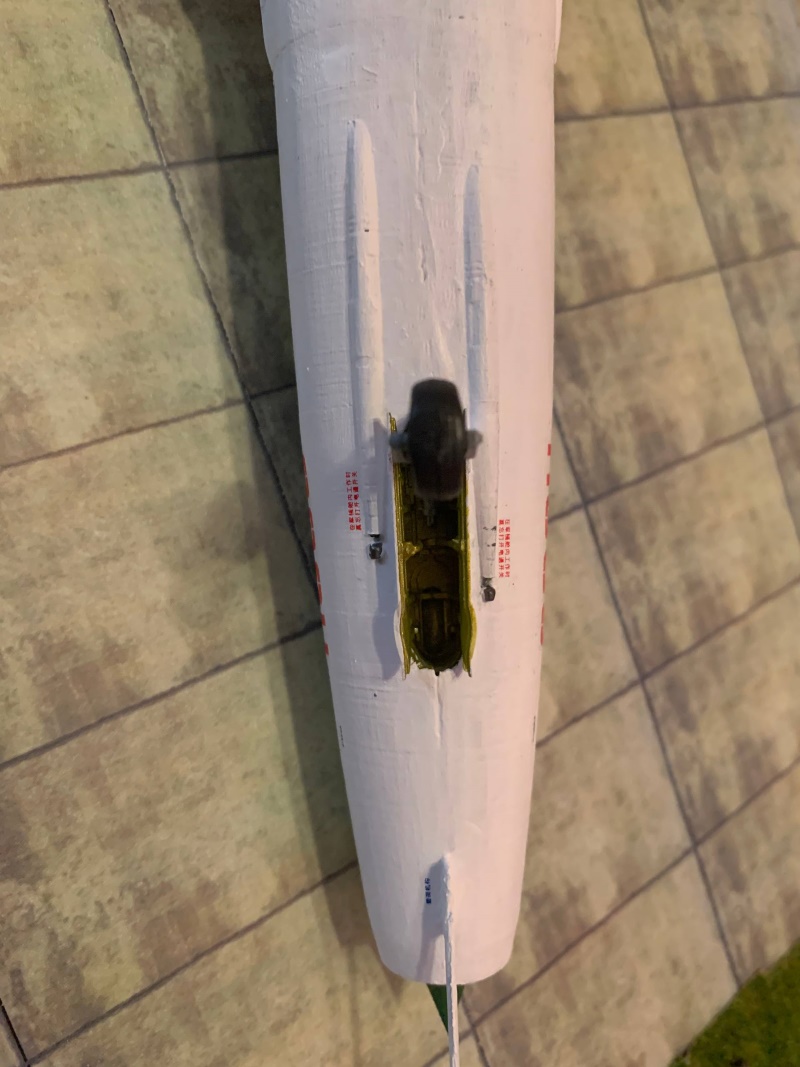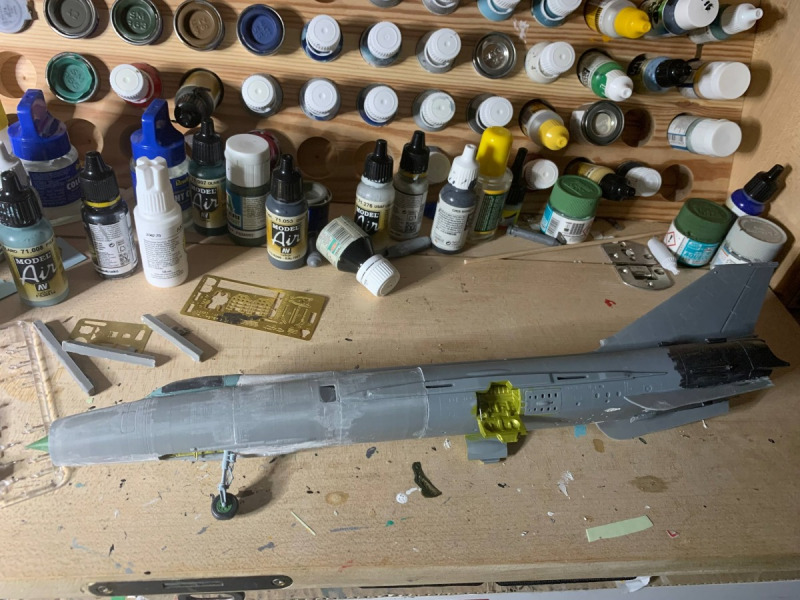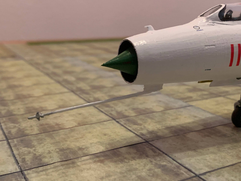 Unter den Tragflächen habe ich jeweils einen externen 480-Liter-Zusatztank sowie eine R-3S-Luft-Luft-Rakete angebracht. An der Centerline befindet sich ein zusätzlicher 490-Liter-Zusatztank, der identisch mit dem der MiG-21 ist. Dieser stammt ebenfalls aus dem bereits erwähnten J-7-Bausatz.