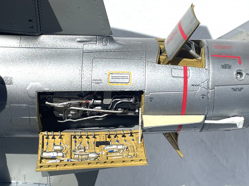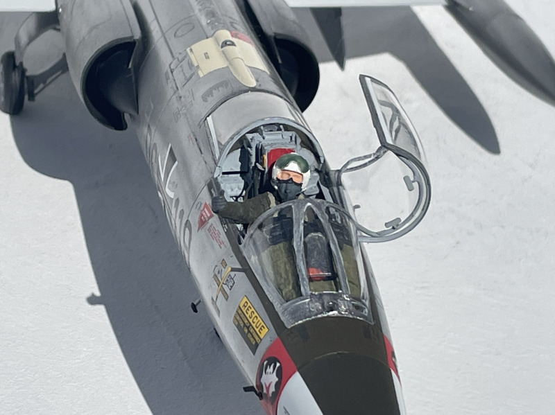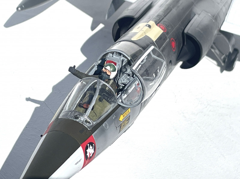 Der Bau auf Basis der RF-104-Bausatzes verlief identisch wie alle meine bisherigen Starfighter aus den Jahren 2017 und 2024, und die verwendeten Zusatzteile sind dieselben Der C2-Schleudersitz stammt genau wir die Schubdüse von Aires, ebenso das Cockpitset, das verwendet wird, um die Einrichtung etwas aufzuwerten. Weiterhin wurde entsprechend des Vorbildfotos die Triebwerk-Wartungsklappe geöffnet dargestellt, dafür hab ein Set von CMK genutzt. Hier ist auch der dann sichtbare Teil des Triebwerks enthalten. Ich hab den Piloten so eingesetzt das er ungefähr wir auf dem Vorbildfoto aussieht.
