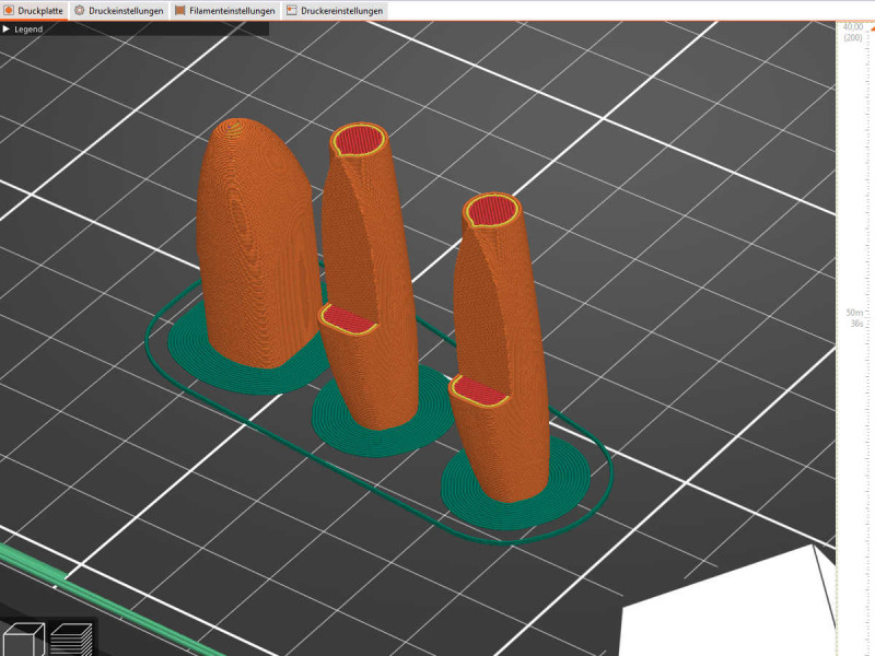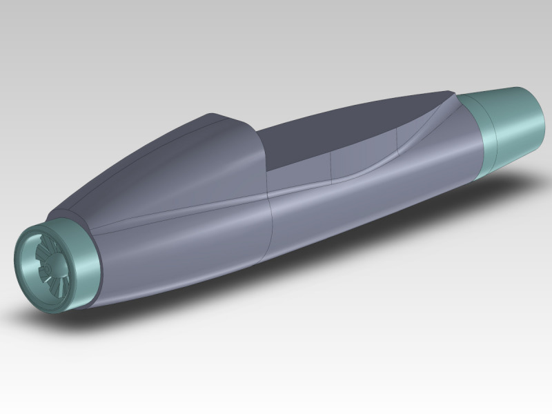 Für die Triebwerke nutzte ich die von meinem Arbeits- und Modellflugkollegen Dominik resingedruckten Impeller, die ich für meinen Turbo-Habicht ( https://www.modellversium.de/galerie/artikel.php?id=19873&fscode=23800 ) konstruiert hatte. Er hatte mir noch zwei davon als Reserve gedruckt, somit waren die dann auch gleich verwertet. Diese trennte ich in der Mitte durch und konstruierte den passenden Mittelteil der Turbinengehäuse. Die Teile entstanden mit meinem Filamentdrucker. Im vorderen Bereich wurde der Übergang zu den Lufteinlässen mit Spachtelmasse angeglichen.