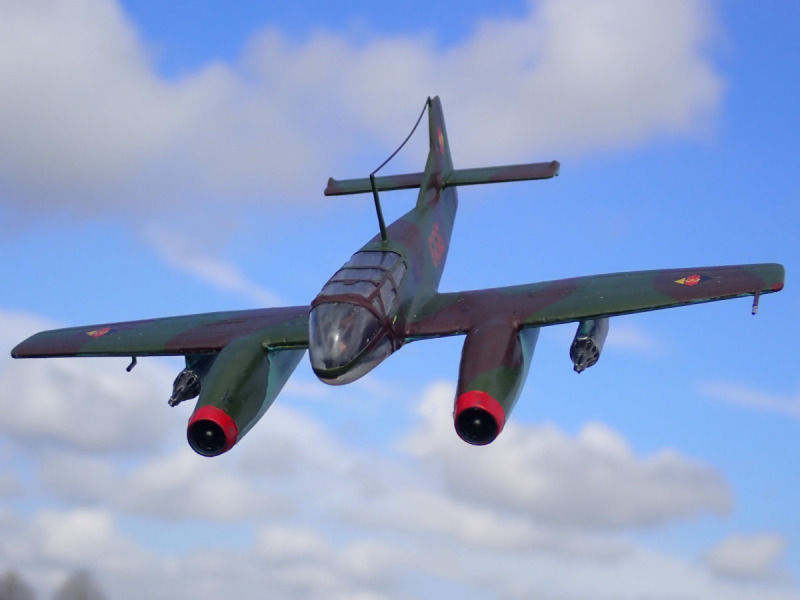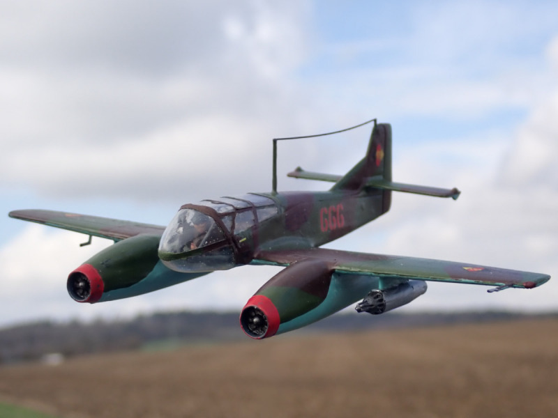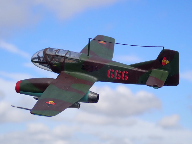 Lackiert habe ich das „What if“ mit Emailfarben von Humbrol und Revell, mit dem Pinsel. Die Decals stammen aus Bausätzen von AZ (He 162 C, NVA-Markierungen) und KP (SIAI Marchetti SF-260, Wartungs- und Warnhinweise). Vor dem Anbringen der Decals versiegelte ich mit glänzenden Klarlack, danach mit seidenmattem. Dann erhielt das Modell ein leichtes Washing und die Ruderspalte wurden mit einem schwarzen Holzstift hervorgehoben. Als das trocken war, sprühte ich die fiktive B9 STW mit mattem Klarlack ein. Alle Klarlacke sind von Mr.Hobby.