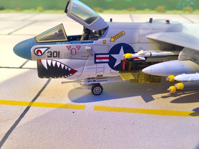 Ansonsten hat mir der Hobby-Boss Bausatz gut gefallen, was die sonstige Vorbildtreue anbetrifft. Feine Oberflächendetails sowie offen darstellbare Electronic-Bays haben mir gut gefallen. Daher zog ich diesen Bausatz denen von Fujimi und Italeri vor. Unterflügelbewaffnungen aus entsprechenden Hasegawa Sätzen habe ich ebenfalls verbaut. Zusätzlich noch Sidewinder Raketen von Eduard. Die Decals stammen von einem Italeri Bausatz und ließen sich sehr gut verarbeiten. Die Passgenauigkeit der Bausatzteile war zufriedenstellend, ohne nennenswerte Probleme beim Zusammenbau. Ein wenig Flüssigspachtel war allerdings notwendig.