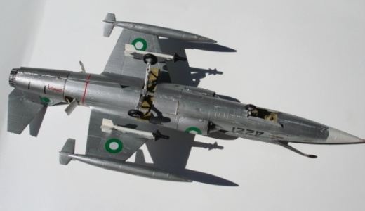 Das Modell entstand aus dem Italeri-Bausatz. Beim Zusammenbau, der relativ zügig voran ging, traten keine Probleme auf. Bemalt wurde das Modell mit Revell Aqua Color Aluminium 99, Eisen 91 sowie Weiß matt 05, Schwarz matt 08, Karminrot 36 und Grau Matt 57. Die Farben für den Fahrwerkschacht und die Innenseite der Bremsklappen wurden mit einem Mix aus Gelb matt 15 und Bronzegrün 65 angemischt. Die Farbe wurde mit Pinseln aufgetragen, da die Aqua Color Farben eine hohe Deckkraft haben und fast gleiche Ergebnisse wie beim Brushen (fast). Ein Airbrush-Set bekam ich erst später, lange nach diesem Modell. Das Einzige was an dem Bausatz zu bemängeln war, waren die Decals. Man konnte aus drei verschiedenen Versionen (USA, Pakistan, Taiwan) wählen, und als erstes hatte ich die US Version im Sinn. Doch die Decals zerrissen schon beim Abziehen (die Hoheitszeichen) oder verklebten. Daher griff ich gleich zu den pakistanischen Decals, die sich besser verarbeiten ließen. Zum Schluss kam noch die Waffenzuladung an das Modell. Ich klebte die zwei Flügeltanks, die einen typischen Starfighter-Look machen, an. Dazu noch zwei AIM-9 Sidewinder Luft-Luft Raketen, da noch zwei weitere Tanks den Starfighter doch ein bisschen langweilig aussehen lassen würden. Mit dem Endergebnis bin ich sehr zufrieden und der nächste Starfighter wird schon bald auf dem Basteltisch liegen.