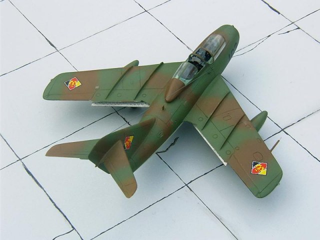 Das Modell habe ich mit X606 (Hellblau) an der Unterseite und mit X623 (Grün) bzw. einem Mix aus X614+R80 (Dunkelbraun) auf der Oberseite gespritzt. Wieso ich diesen ungewöhnlichen X-Tra/Revell-Mix angewandt habe, kann ich auch nicht mehr nachvollziehen. Jedenfalls hat es funktioniert. Die Decals stammen zum Teil vom TOM NVA Bogen und dem HI-Decal Bogen für die MiG-15. Bei einigen ist das ungeliebte Silvering zu erkennen. Zum Abschluss habe ich alles mit Seidenmatt versiegelt.
