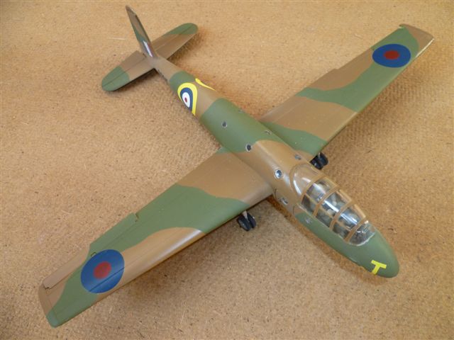 Die zweiseitige Bauanleitung ist angesichts der geringen Teilezahl für den Zusammenbau ausreichend, für die Lackierung allerdings nicht. Zum Glück liefert das Internet genügend Vorlagen. Das gelb / schwarz gestreifte „Hummeldesign" britischer WW II Schulsegler ist wie schon bei der Horsa ein Hingucker. Lieber aber die Unterseite von Flügel und Rumpf separat lackieren und erst dann die Teile montieren, ihre Nerven werden es ihnen beim. Abkleben danken. Ein intelligentes Design des Rumpf / Flügel Übergangs und die gute Passgenauigkeit gestatten dies ohne weiteres. Die Decals sind hauchdünn und legen sich gut an. Eine böse Überraschung hielt der Bausatz aber dann doch noch parat: der eigentlich weiße, mittlere Ring der Kokarden für die Flügelunterseite war unbedruckt und damit transparent. Statt die betreffende Stelle weiß zu grundieren, habe ich zu den Abziehbildern eines alten Airfix Bausatzes gegriffen. Die Blautöne stimmen nicht völlig überein, das fällt aber auch nicht groß ins Auge. Eher schon, dass die Rumpfkokarden viel zu groß sind. Besser auch die ersetzen - leider ist mir das erst im Nachhinein so richtig bewusst geworden. Trotz kleinerer Defizite: der Bausatz macht Spaß, und der „Exote" macht sich gut in der Vitrine, vor allem wenn er neben seinem „großen Bruder", der Horsa, parkt.