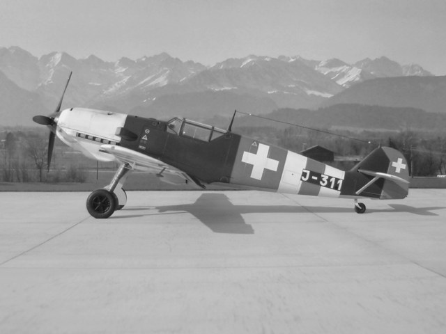 Messerschmitt ME-109 E-1 J-311 der Schweizer Fliegertruppe Die Bezeichnung „BF“ wurde in der Schweiz nicht verwendet. Nach einigen Vorfällen mit Jagdflugzeugen der USAAF wurden Mitte September 1944 in der Schweizer Fliegertruppe rot-weiße Erkennungsstreifen eingeführt.
