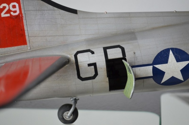 Es folgte die Lackierung des Exterieur. Als erstes wurde das komplette Modell mit Aluminium aus der Revell Aqua Color Serie lackiert. Einzelne Panele wurden dann mit aufgehelltem oder abgedunkeltem Aluminium überlackiert. Anschließend erhielt die gesamte Unterseite eine weitere Überlackierung (nicht deckend) mit erneut abgedunkelter Grundfarbe, die Oberseite entsprechend mit aufgehelltem Aluminium (Licht und Schatten). Die roten Partien werden abgeklebt und mit Revell Aqua Color Rot lackiert. Das gesamte Flugzeug wurde dann in mehreren Schichten mit Klarlack (Glanz) überzogen, um somit eine glatte Basis für die vielen Decals der „Yankee Lady" sowie für die Stencils zu schaffen. Auch die Decals werden dann mit Glanzlack nochmals versiegelt. Anschließend werden die schwarzen Streifen an den Tragflächen abgeklebt und in Mattschwarz sowie die olivgrünen Bereiche in diversen Olivfarben lackiert, welche auf den Oberseiten dann noch aufgehellt wurden.