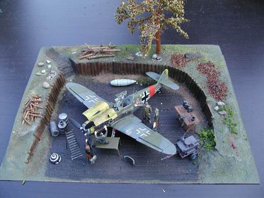 Geschichte:Angeregt durch das Dioramen-Buch von Jens Nissen habe ich nochmals versucht ein Diorama zu bauen. Als Grundlage diente ein Revell-Bausatz einer BF 109 G10, der mit einem Update-Satz der Firma FM Details aufgerüstet wurde. Die Grundplatte ist eine Splitterbox, die ich bei BK-Model erworben habe. Ausgeschmückt mit einem eigenhändig hergestellten Baum und einigen Figuren, denke ich, ist doch ein ganz netter Anfang geglückt.