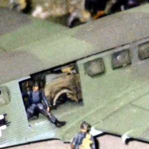 In der Ju 52 befindet sich ein Kübelwagen, die „Tante Ju“ ist bereit zum Abflug, die Motoren laufen schon. Bei dem VW166 Schwimmwagen von Hasegawa wurde die Wasserschraube abmontiert und stattdessen eine Art Anhängerkupplung drangemacht. Mit dieser zieht der Wagen eine verpackte Bf 109 noch schnell von der Startbahn. Doch plötzlich greifen ein paar Jabos an!