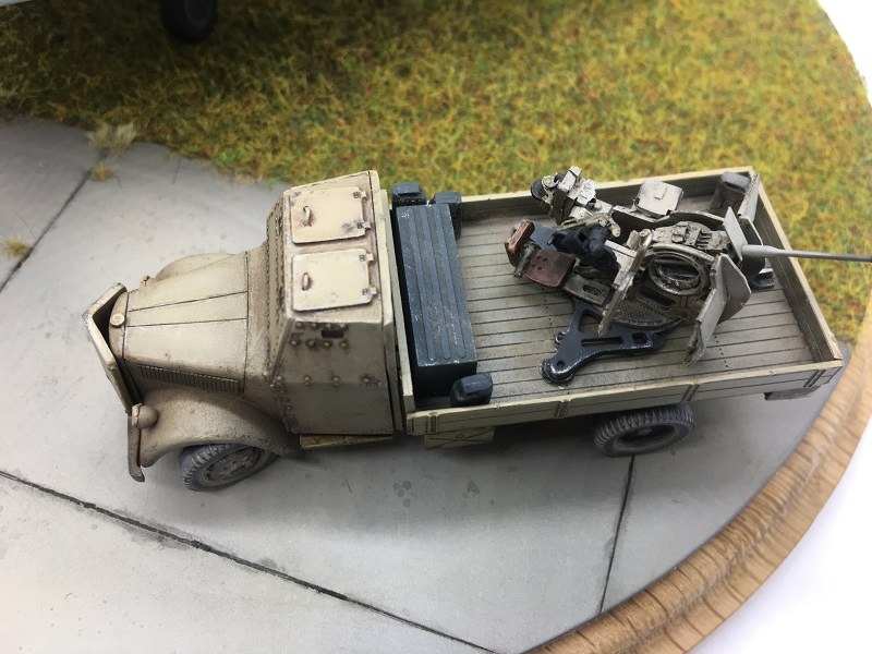 Das AZmodel ist sehr rudimentär und wurde von mir hauptsächlich im Bereich der Triebwerke, des Cockpits und der Bewaffnung etwas nachdetailliert. Lackiert wurde hauptsächlich mit GUNZE-Farben. Das Flak-Fahrzeug aus den letzten Kriegstagen erhielt noch ein „Jaboschreck"-Rohr von Schatton.