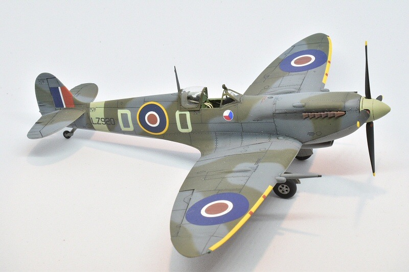 Die Abziehbilder stammen alle aus der Ersatzteilkiste von mindestens fünf verschiedenen Herstellern. Qualitativ war von „hervorragend“ bis „Katastophe“ alles dabei. Womöglich waren manche einfach zu alt, aber am Ende hat doch alles geklappt. Vorbild für die Lackierung war die Maschine von Wing Commander Jaroslav Hlado. Ich habe mich dabei an einer Bemalungsanleitung von CMR orientiert, da ich von der Maschine nur ein kleines und unscharfes Originalfoto im Internet gefunden habe.