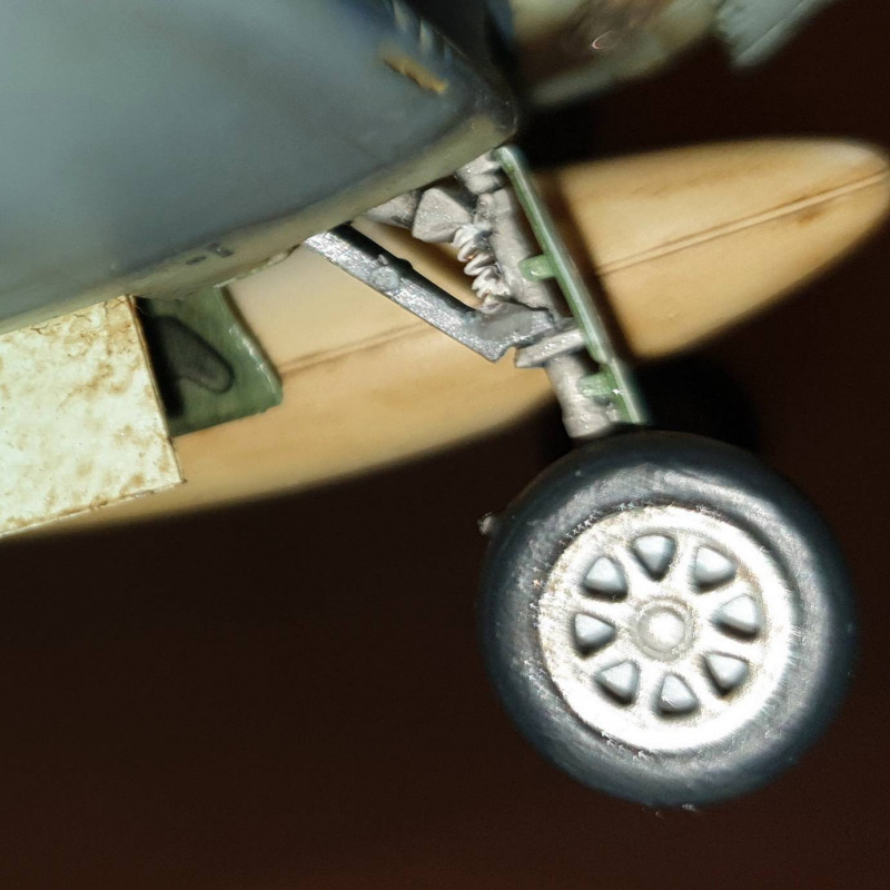 Bei der Lackierung wollte ich was Neues ausprobieren und versuchte es mit zweilagigem Chipping. Dazu wurde das Modell zuerst in Alu grundiert und nach dem Trocken mit Haarspray überzogen. Anschließend kam die typische grüne Grundierung, die ich selbst anmischte, da mir das Grün im Cockpit letztendlich zu dunkel war. Nach ca. ener Stunde Trocknungszeit bin ich mit einem nassen, kurzen und recht harten Pinsel über die Panellines gefahren oder habe diese vorsichtig getupft. Das Wasser dringt durch die Farbe und löst das darunterliegende Haarspray. Sobald dieser Effekt eintritt, ist Vorsicht geboten, da sich sonst sehr große Flächen lösen können. Nachdem dies geschafft war, versiegelte ich das Ergebnis mit Klarlack. Danach kam wieder eine Lage Haarspray und die finale Farbschicht. Hier wurde das Chipping dann wiederholt, so dass zum Schluss ein dreilagiger Farbaufbau sichtbar war. Das Ganze habe ich mit Lack versiegelt, danach ein Postshading mit der Airbrush gemacht und erneut versiegelt.