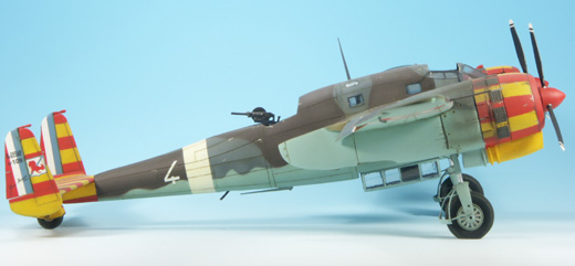 Am Leitwerk sägte ich die Höhenruder aus und befestigte sie in ausgelenkter Position. Das Fahrwerk war aus Zinn- und Fotoätzteilen zusammenzubauen, wobei insbesondere an den aus Zinn hergestellten Fahrwerksbeinen außer den obligatorischen Bremsleitungen noch etliche weitere Einzelheiten ergänzt wurden. An den aus Resin gegossenen Propellerspinnern waren einige Luftlöcher zu verspachteln. Gleiches gilt für die einzeln aus Zinn gefertigten Propellerblätter, deren Guss zwar vorbildlich dünn gelungen ist, die dafür aber auf der Oberfläche etliche pockennarbige Vertiefungen aufwiesen.