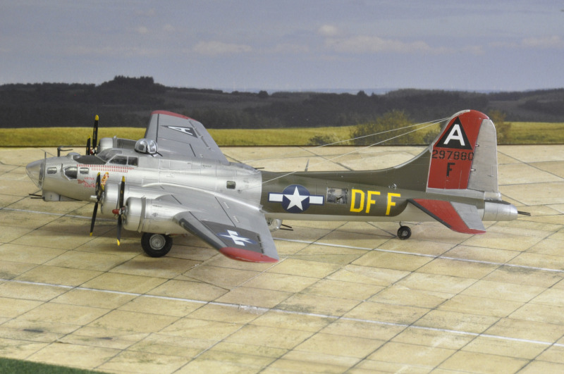 Die Schiebebilder sind für die B-17G-35VE „Little Miss Mischief“ der 8th Air Force vom Februar 1945 oder B-17G-30-BO „Nine-O-Nine“, 8th Air Force, April 1945. Es musste in meinem Fall natürlich die „Little Miss Mischief“ sein, es ist einfach originell, dass sie aus zwei verschiedenen Flugzeugen zusammengesetzt war. Einzelheiten kann man im Internet nachlesen.