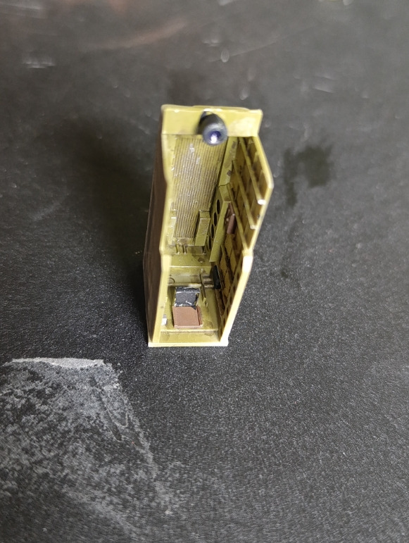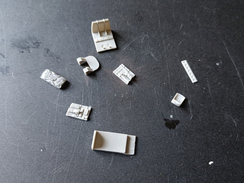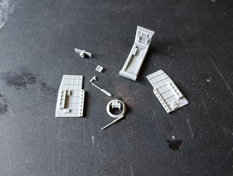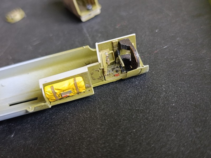 Anschließend begann ich direkt mit der Verarbeitung der Detailsets. Zuerst trennte ich die Resinteile vorsichtig vom Träger und versäuberte sie, bevor ich sie mit Sekundenkleber zusammensetzte. Danach folgte die Lackierung der Bauteile. Neben den Resinteilen kamen auch einige Fotoätzteile zum Einsatz, die zusätzliche feine Details ermöglichten. Die Innenteile wurden vollständig in US Interior Green lackiert, während das Rettungsfloß in Gelb bemalt und anschließend per Hand detailliert wurde. Zum Abschluss trug ich ein Wash auf, um die Strukturen und Vertiefungen besser hervorzuheben.