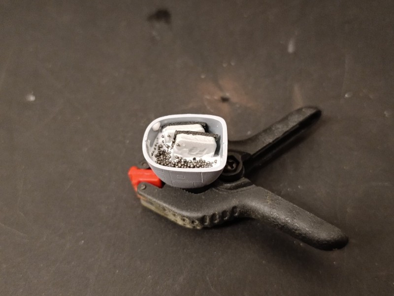 Etwas komplizierter gestaltete sich das Einkleben der beiden Baugruppen. Während sich das vordere Cockpit noch recht eindeutig positionieren ließ, sah es beim hinteren Abschnitt schon anders aus. Da für diesen Bereich im Originalbausatz kein Teil vorgesehen war, hatte der Hersteller auch keinerlei Markierungen oder Passhilfen angebracht. Ich war daher gezwungen, die Teile immer wieder trocken anzupassen, bis alles passte. Mit vielen Klemmen und etwas Geduld gelang es schließlich, die beiden Rumpfhälften sauber zusammenzufügen.