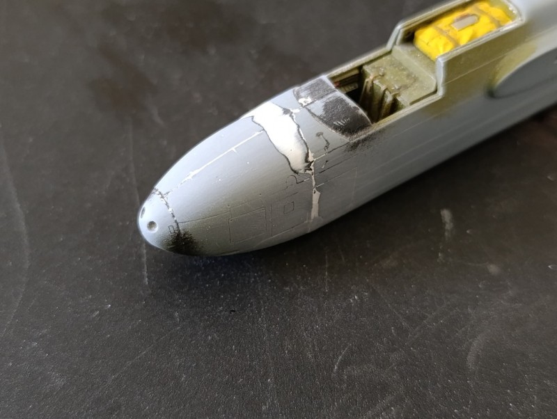 Danach folgte der Zusammenbau und die Bemalung des Motors. Auch die Flugzeugnase wurde montiert. Ihr Vorteil liegt darin, dass sie vollständig geschlossen ist – so konnte problemlos ausreichend Gewicht eingebracht werden, um ein späteres Hecklasten zu vermeiden. Allerdings erforderte die Nase einiges an Nacharbeit: Sowohl beim Versäubern der Bauteile als auch beim Übergang zum restlichen Rumpf war viel Feinarbeit nötig, da sich hier eine kleine „Hucke“ zwischen Nase und Rumpf bildete.