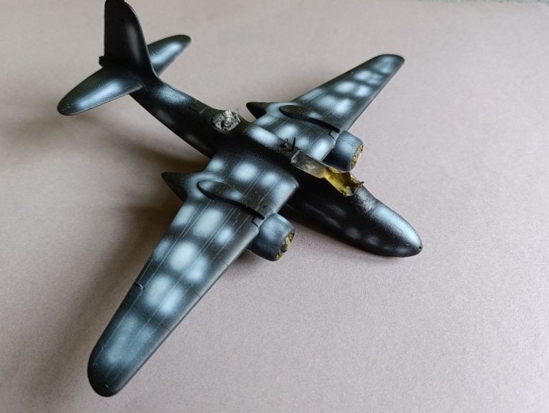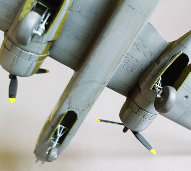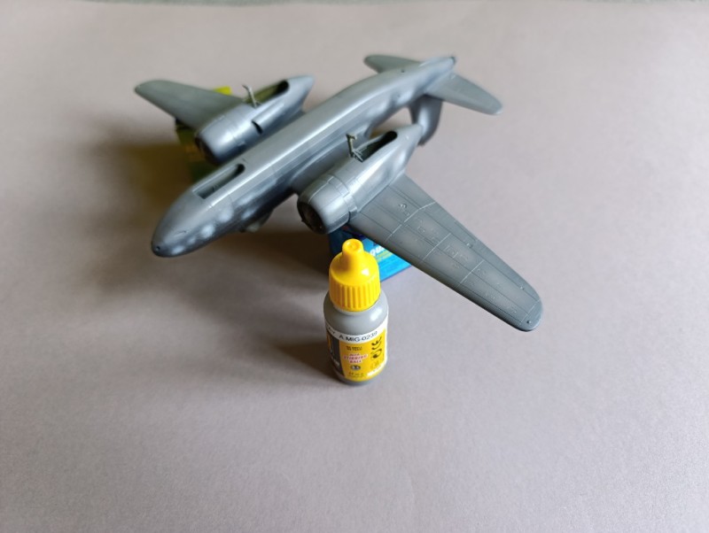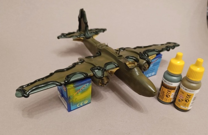 Die Grundierung zeigte schließlich, dass sich die ganze Arbeit gelohnt hatte – das Modell war sauber gebaut und wies keine größeren Unsauberkeiten auf. Ich konnte also beruhigt mit der Lackierung beginnen. Dabei verwendete ich ausschließlich Farben von Ammo by Mig: Nr. 0239 Neutral Gray, Nr. 0237 FS23070 Dark Olive Drab sowie Nr. 0238 Medium Green für die Tarnflecken. Wie gewohnt lackierte ich zunächst den grauen Unterseitenbereich des Flugzeugs und anschließend den oberen Rumpf. Zum Abdecken der Tarnflecken und für die Übergänge zwischen den Farbtönen kam fettfreie Maskierknete zum Einsatz.